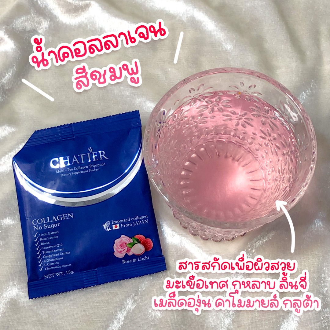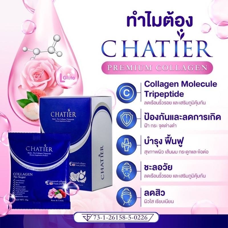 CHATIER Premium Collagen ชาเทียร์ คอลลาเจน น้องฉัตร กล้าพูดว่าพรีเมี่ยมตั้งแต่ขั้นตอนการเลือกแหล่งปลาที่นำมาสกัดคอลลาเจน ซึ่งมีความบริสุทธิ์สูง (ยืนยันจาก 3 certificates) นอกจากนี้ยังผลิตด้วยระบบ Enzymatic ลิขสิทธิ์จากญี่ปุ่น รวมไปถึงคัดสรรสุดยอดสารสกัดเพื่อให้ได้ผลลัพธ์ที่ดีที่สุด ทานง่ายไม่คาว 1 กล่อง 7 ซอง 7 วันท้าให้ลอง ซ่อมแซมผิวสุดๆ สารสกัดนำเข้าที่ PREMIUM ที่สุด – วิตามินผิว ช่วยฟื้นฟูบำรุงครบในกล่องเดียว – ลดเลือนริ้วรอย และเสริมภูมิคุ้มกัน – ป้องกัน การเกิดฝ้า กระ จุดด่างดำ – บำรุง ฟื้นฟู สุขภาพผิว เส้นผม กระดูกและข้อต่อ – ลดสิว ผิวใส เรียบเนียน ✅ไม่มีสารอันตราย ✅ไม่ผสมแป้ง ✅ไม่มีน้ำตาล ✅ทานต่อเนื่องไม่อ้วน ข้อมูลส่วนประกอบ : เนื่องจากปลาจากญี่ปุ่นที่นำมาใช้ผลิตคอลลาเจนเป็นปลาน้ำจืด คนแพ้อาหารทะเลทานได้